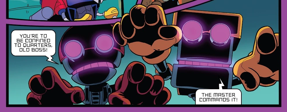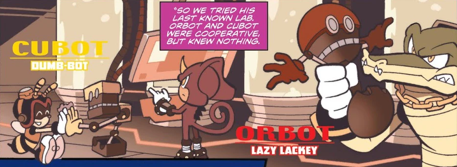 At some point after Dr. Eggman disappeared, Cubot and Orbot were later discovered in Eggman's last known lab by the Chaotix, who were tracking Eggman. Although the two robots were cooperative when the Chaotix interrogated them, they knew nothing about Eggman's whereabouts. (StH: #5)