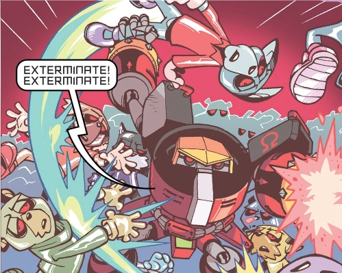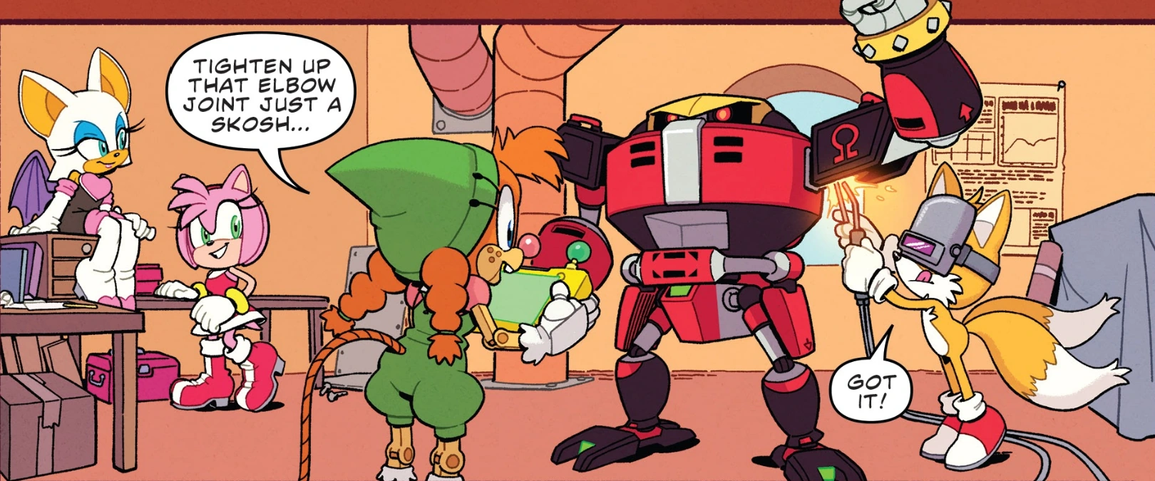 The Restoration and its allies rose to meet their foe and his new mecha, with Gemerl attempting to strike first. The mecha deployed a trap that caused Gemerl to succumb to Dr. Eggman's control, empowering the mecha further and the doctor began to open fire on the heroes. Thinking quickly, Tails and Rouge were able to find an access panel on the giant robot and release Gemerl from the doctor's control, but they also discovered Omega would be much harder to release and Tails attempted to find an ejection protocol. Seeing that the young fox had hacked into his machine, Dr. Eggman opened up his cockpit and opened fire with a laser handgun on Tails and Rouge, nearly disintegrating them. Still trapped in the mecha but with his primary systems restored, Omega's directives to destroy Dr. Eggman conflicted with his orders to destroy Eggman's enemies and caused a cascade error, disabling the mecha and its weapons and allowing the heroes to attack the giant robot, destroying one arm and hindering its legs whilst trying to free Omega.