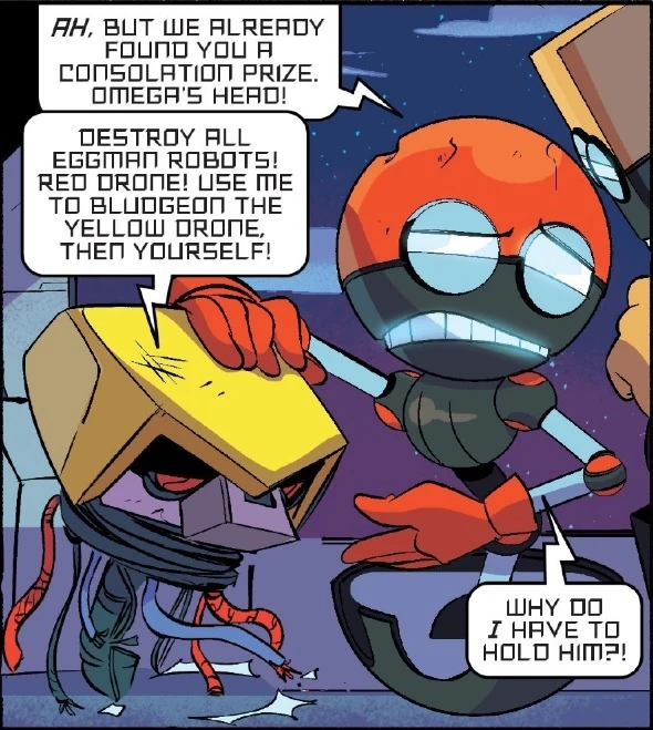 Omega has frequently shown a preference or even fervor for acts of violence, be they against Eggman's robots or momentary foes, and actively enthuses any plan that involves a physical altercation. Omega also seems to shy away from anything resembling amiable behavior, such as refuting being considered Sonic's "friend," objecting to calling fighting alongside Sonic "helping" him, calling verbal support being "patronized" and refusing to show mercy on Zombots that were once innocent civilians and allies.