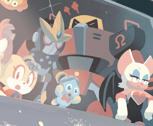 - Before Omega was formally introduced in the comics, he made an unofficial appearance on the retail incentive cover of Sonic the Hedgehog #9 along with Gemerl, Cream the Rabbit and Cheese, possibly meaning all four of them were meant to appear earlier into the comics' run.