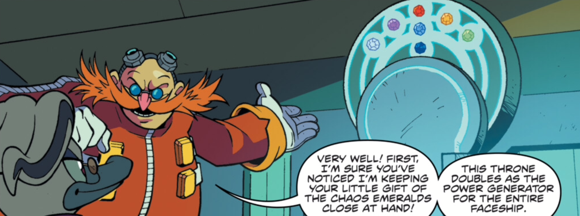 - Bridge - The Faceship's control room. From here, Dr. Eggman would oversee the vessel's operation and observe his Metal Virus plan unfold. Orbot and Cubot would operate the ship's helm controls while Eggman sat upon his command chair, which also served as a cradle for the Chaos Emeralds that powered the ship.