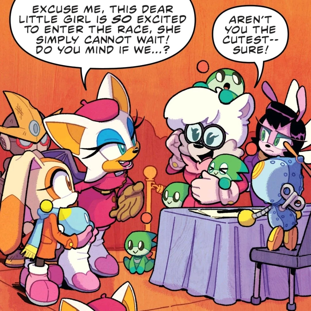 - Roll Call: Roll Call acts as a quick reference guide to new readers about the characters. This issue provides data files on Sonic, Amy, Tails, Rouge, Omega, Cream, Cheese and Gemerl.