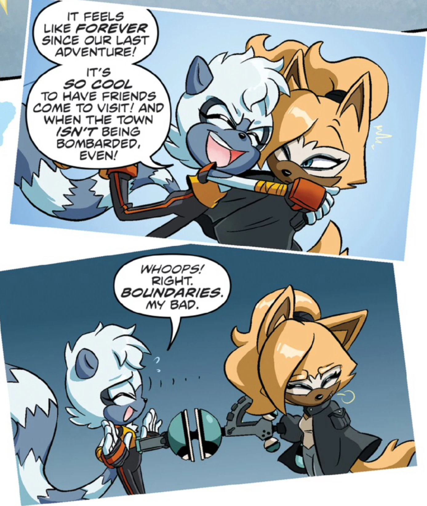 As everyone got ready to leave the island, Tangle found friendship with Whisper. When Sonic came by to talk to them, Tangle told him that she felt that she was not ready to return to her old life as her new one had become so crazy and exciting. After this, Tangle urged Whisper to tell Sonic the joke about a toaster she had told her. Whisper instead shyly put her mask scope back on, leaving Tangle to wonder if this was due to something she said. Sonic then left them, telling Tangle to give Whisper some space. (StH: #12)